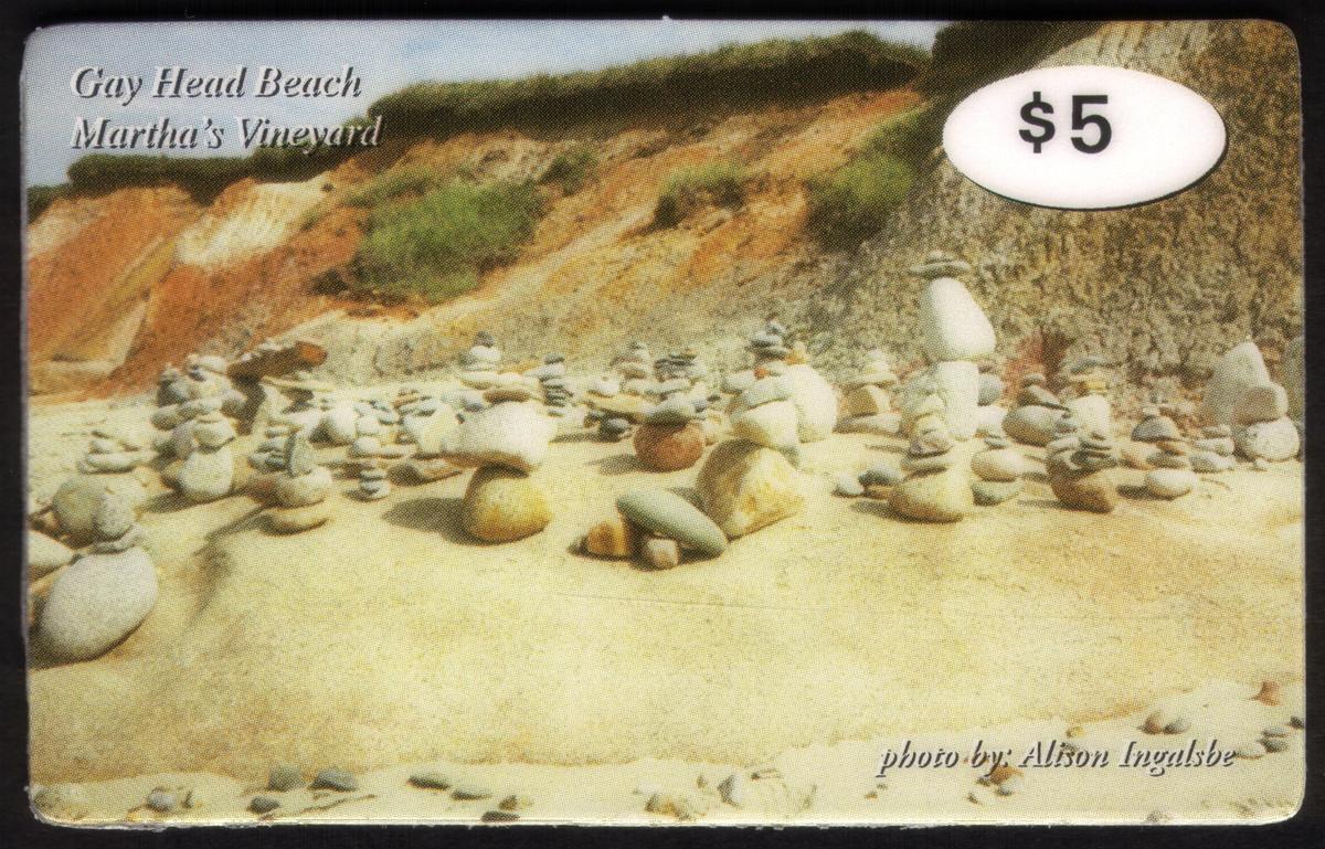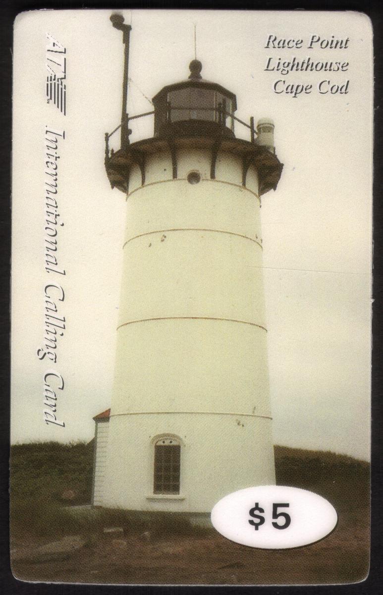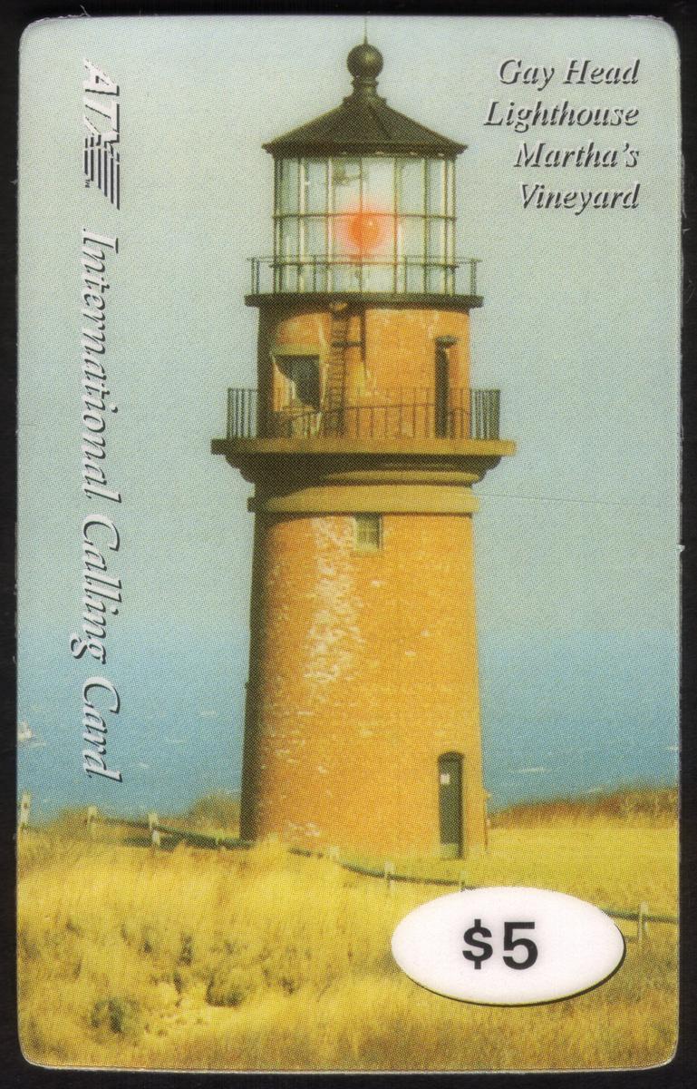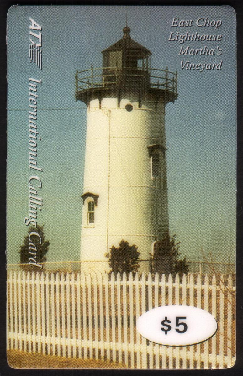 This set of nine collectible AT&T International Calling Cards each features a vivid photographic image of a notable lighthouse or scenic beach from Nantucket, Martha’s Vineyard, and Cape Cod, highlighting popular tourist attractions in New England. Each card has a clear $5 value displayed in an oval at the bottom right corner. The AT&T logo with the text "International Calling Card" is placed vertically along the left side of every card. The names and locations of the lighthouses or beach are printed at the top right corner of each card in matching font style.