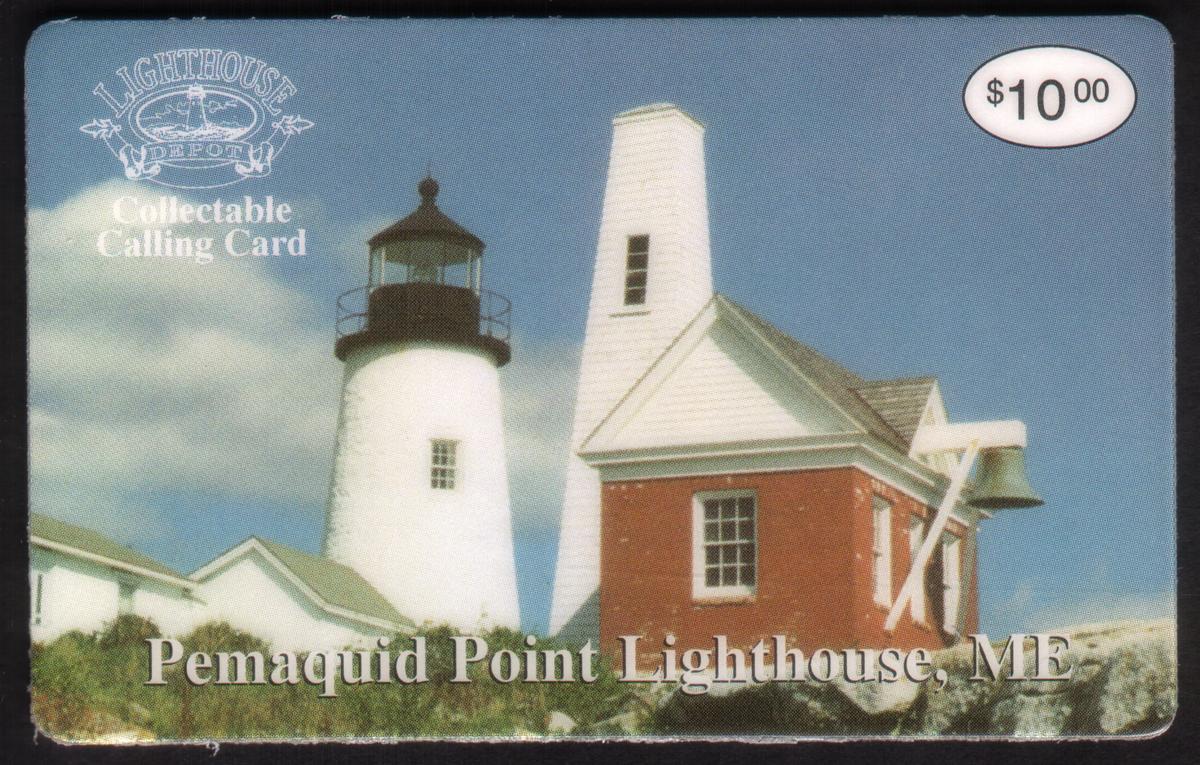The card is part of the Lighthouse Depot Series and has a face value of $10. The design reflects elements of travel and tourism connected to famous lighthouses, making it appealing for collectors interested in maritime themes. The name "Pemaquid Point Lighthouse, Maine" is clearly displayed on the card, along with the words "American Telecard," indicating its use as a collectible American phone card.
