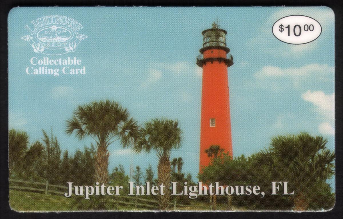 The front face of the card includes the name "Jupiter Inlet Lighthouse" clearly visible. The overall presentation combines natural landscape elements with the architectural details of the lighthouse, capturing the essence of Florida’s maritime heritage. This collectible serves both as a functional phone card and as a tribute to an iconic American lighthouse.
