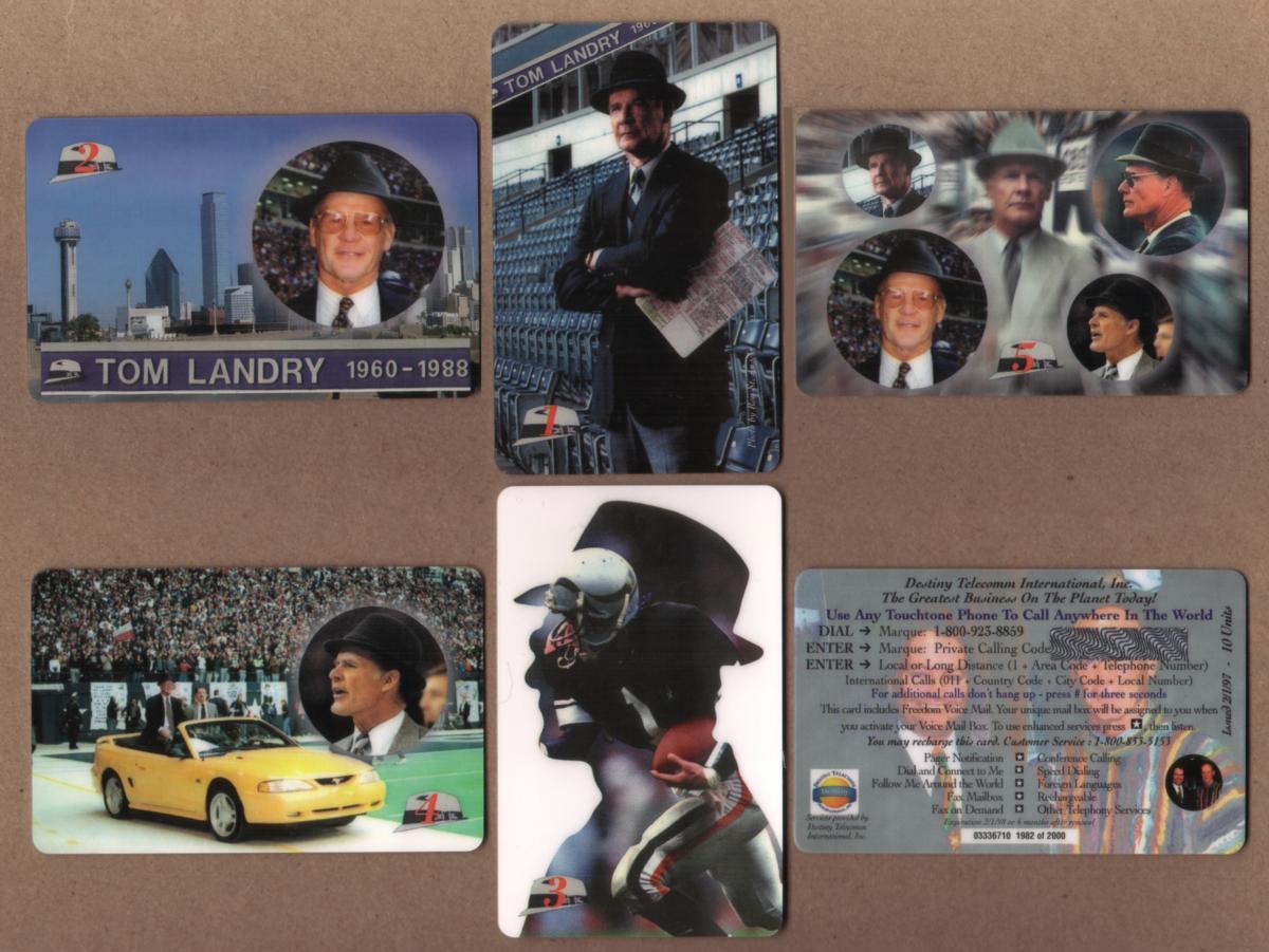 The design incorporates images of football players and footballs, connecting to the sport's theme and the Dallas Cowboys franchise. The cards bear logos referencing the Pro Football Hall of Fame and feature the text "Tom Landry Hall of Fame Football Coach" to honor his legacy. The set is titled as a "Set of 5," produced under Destiny Telecomm.