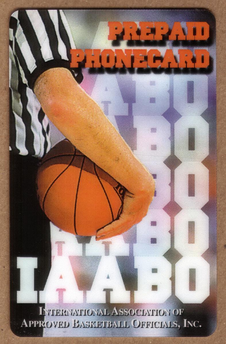 This collectible phone card features a basketball-themed design focused on basketball refereeing and officials. The card prominently displays the logo and text for the International Association of Approved Basketball Officials (IAABO), which is an organization dedicated to basketball refereeing. The IAABO emblem appears in white with a silhouette of a referee in motion holding a whistle, set against a solid black background.