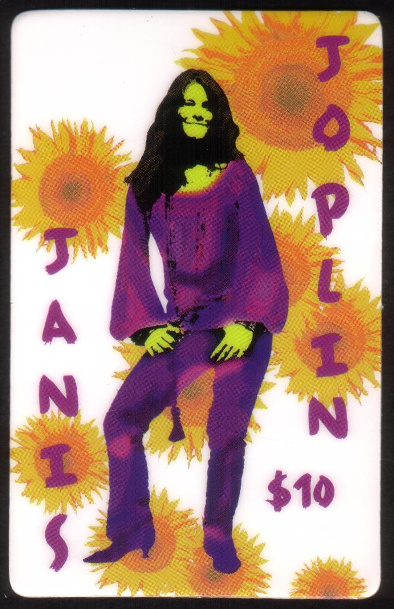 This is a set of two collectible $10 entertainment cards dedicated to Janis Joplin, a famous musical artist known for her impact on folk, rock and roll, and psychedelic music in the 1960s. The first card features a stylized graphic of Janis Joplin standing, wearing a flowing, deep purple outfit. She is rendered in a purple and yellow-green color scheme, set against a white background with large, vivid sunflowers scattered around her. The name "JANIS JOPLIN" is displayed vertically and horizontally in bold purple letters with the denomination "$10" in the lower right corner.