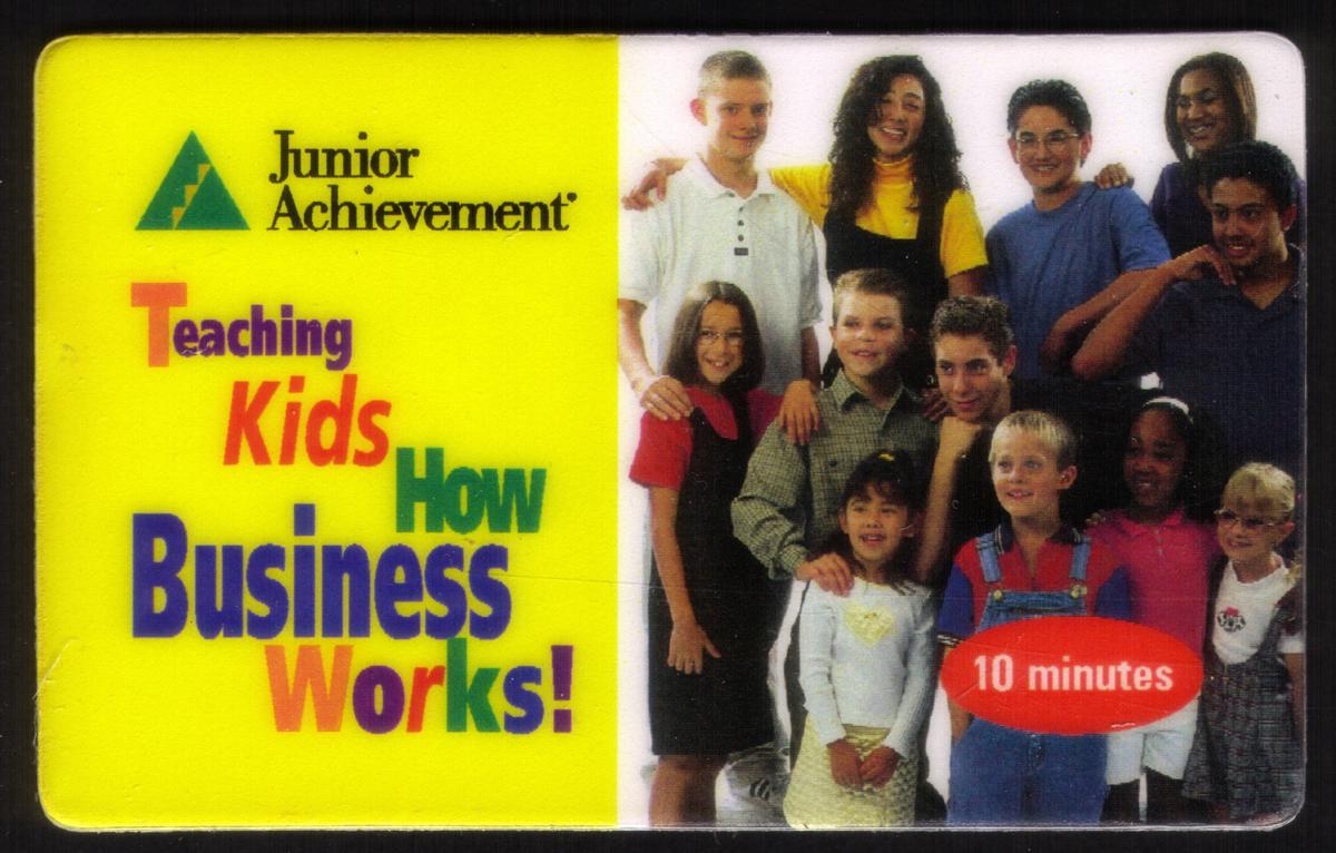 This collectible phone card features a colorful artwork celebrating Junior Achievement, an organization focused on educating children and youth about business and economics. The card prominently displays the Junior Achievement logo and includes the text "10m Junior Achievement Children 'Teaching Kids How Business Works'." The AT&T logo is also visible, indicating the communication provider associated with this card.