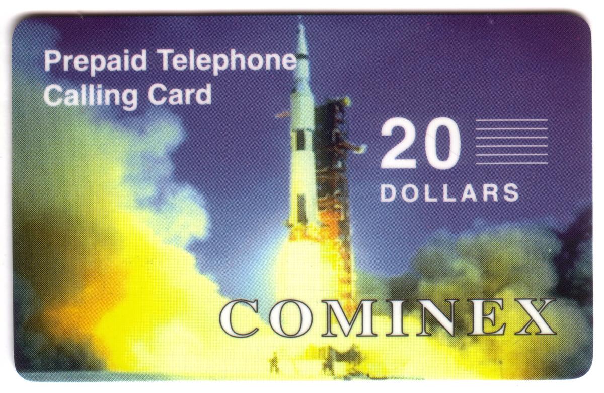 The card features the denomination “$20” printed on the upper right corner. Along the left side, the word “Space” is prominently displayed in large, white capital letters running vertically. At the top left corner, the issuing company “COMINEX” is printed, identifying the origin of the card. The overall design emphasizes the theme of space exploration and rocket technology, highlighting the dynamic moment of lift-off.