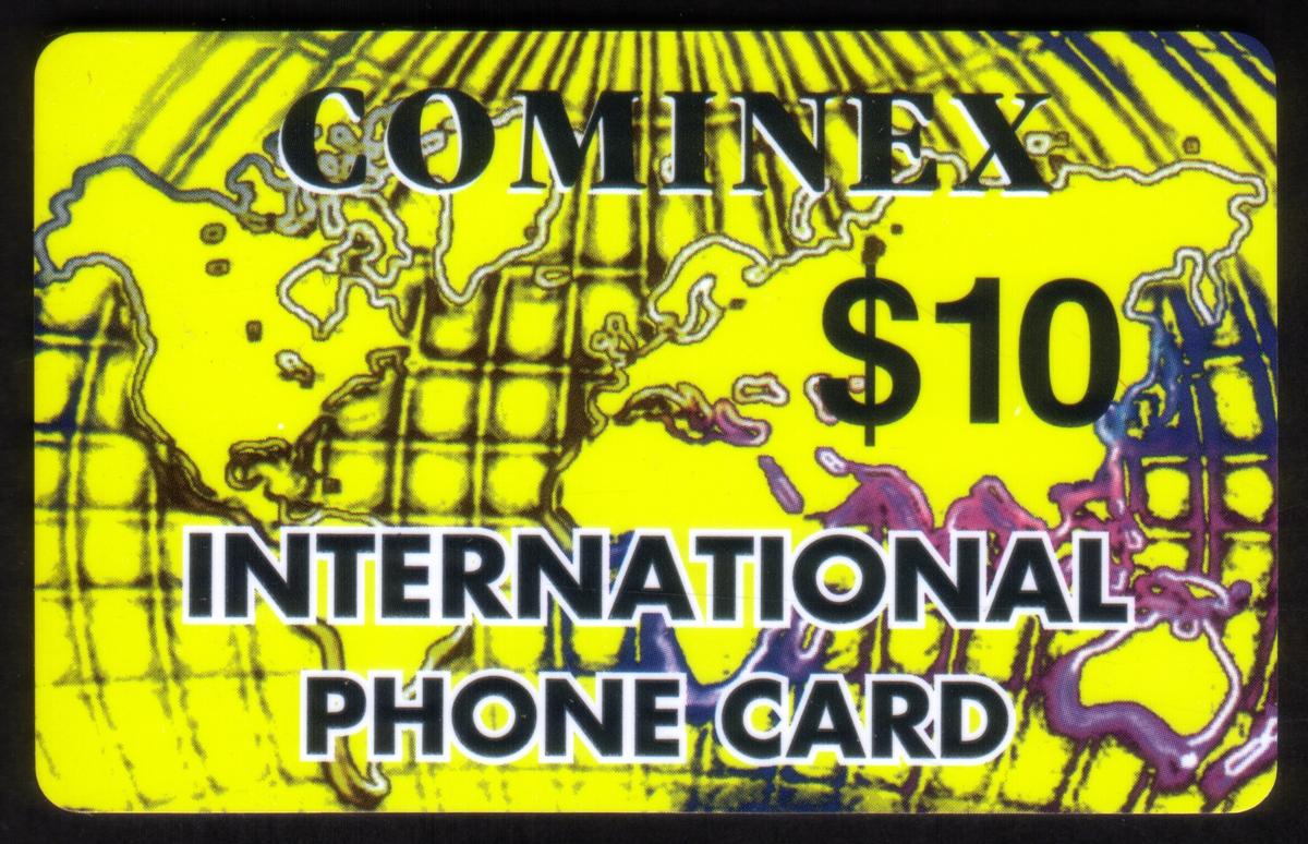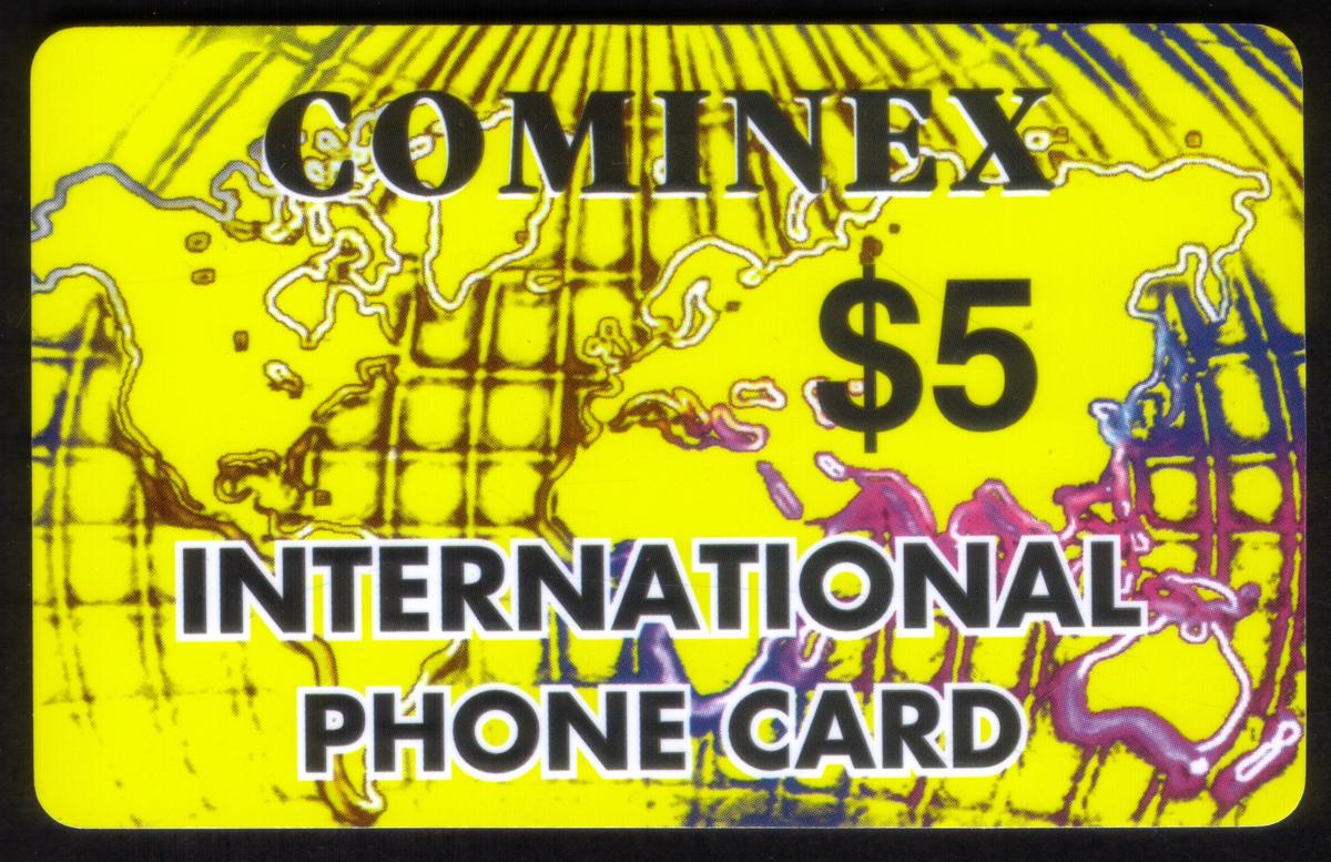The cards prominently show the text "COMINEX" in large black uppercase letters with a white outline at the top. Underneath, the cards state their value in large black numerals preceded by a dollar sign ($5, $10, and $20 respectively). Below the denomination, all three cards have the text "INTERNATIONAL PHONE CARD" in white uppercase letters outlined in black, centered clearly across the lower half of each card.