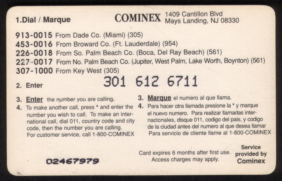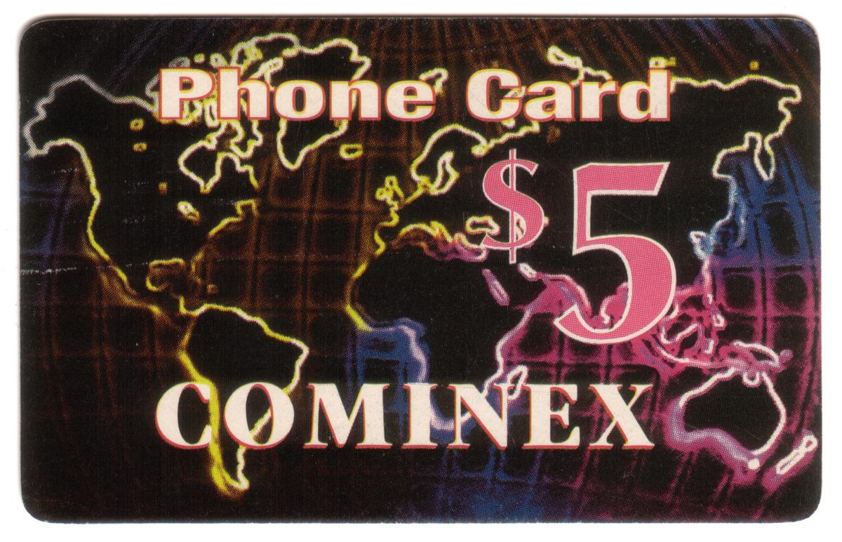 The brand name "COMINEX" appears in bold white letters centered towards the bottom of the card. The overall style of the card combines bright, colorful outlines of the world’s continents with a grid pattern beneath, highlighting an interconnected, technological aesthetic. The card references usage connected to Florida regions, including Dade County, Miami, Broward, Palm Beach, and Key West.