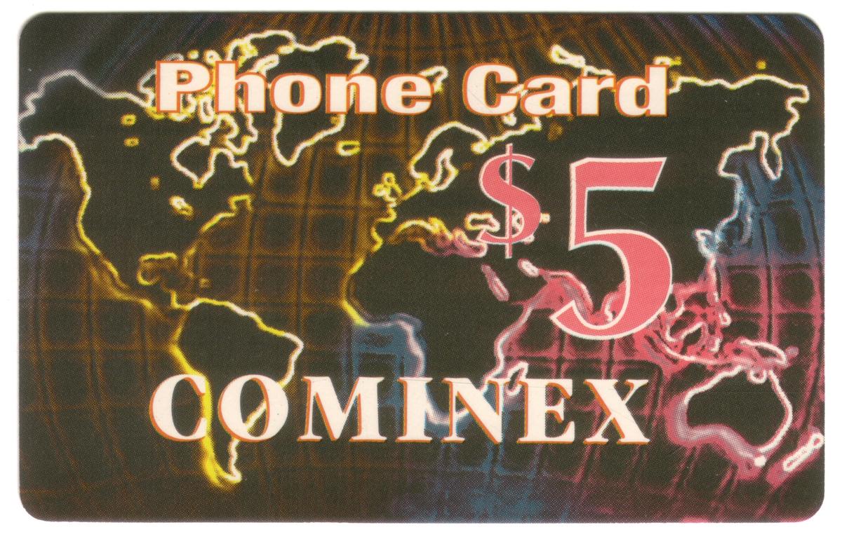 This collectible phone card features a stylized world map with bright neon-like outlines of the continents against a dark background. The map highlights major landmasses including North America, South America, Africa, Europe, and Asia. The card prominently displays the text "Phone Card" in white and "$5" in large pink numbers near the upper right section. Below the denomination, the brand name "COMINEX" appears in bold white letters centered on the card.