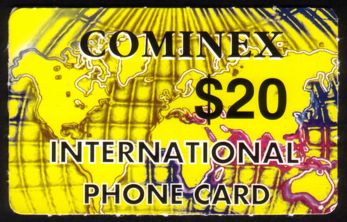 This is a collectible international phone card issued by COMINEX with a face value of $20. The card is printed on paper and features a distinctive design with a predominantly yellow background. The main artwork on the card presents an oddly designed world map that covers most of the card’s surface. The map uses unconventional shapes and lines, making it stand out from typical world map depictions.