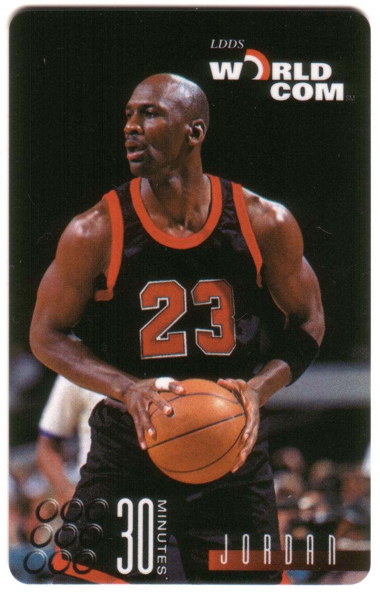 The top right corner of the card displays the LDDS WorldCom logo, indicating the card’s association with WorldCom. At the bottom left, the card indicates it has “30 MINUTES” of stored value, making it a functional collectible mag-stripe card. The word “JORDAN” is printed at the bottom right in a modern, clean font, emphasizing the player’s iconic status. This card combines basketball imagery, celebrity recognition, and stored-value utility in one collectible item tied to NBA basketball and Michael Jordan’s celebrated career.