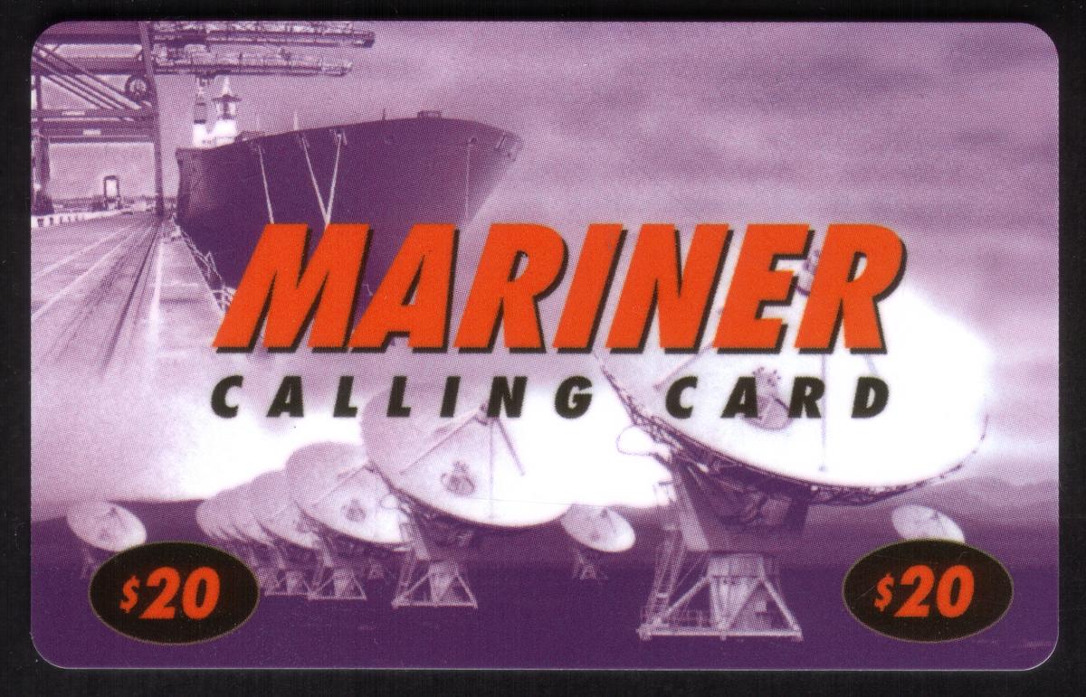 This collectible phone card is titled "Mariner Calling Card" and has a value of $20, displayed twice on the front in red text within black ovals on both the left and right lower corners. The card’s background features multiple large satellite dish receivers arranged in a row, along with the front portion of a large ship on the left side. The overall color scheme of the image is dominated by shades of purple, with the satellite dishes, ship, and dock appearing in purple tones against a cloudy sky. The card’s title "MARINER" is prominently printed in large, bold, orange capital letters across the top center, with "CALLING CARD" in smaller black capital letters beneath it.