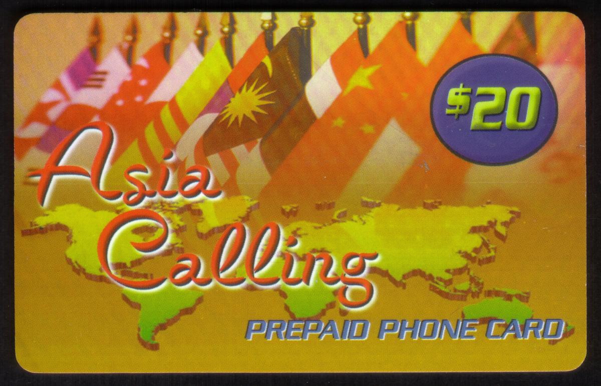The card has the title "Asia Calling" written in stylish orange and red script located on the left side, with the words "PREPAID PHONE CARD" printed underneath in blue capital letters. On the right side, a blue circle contains the card’s value marked as "$20" in bold yellow-green numerals and symbols. The bottom right corner also indicates the provider, Fusion Telecom, though the main focus is on the flags and Asian map imagery.