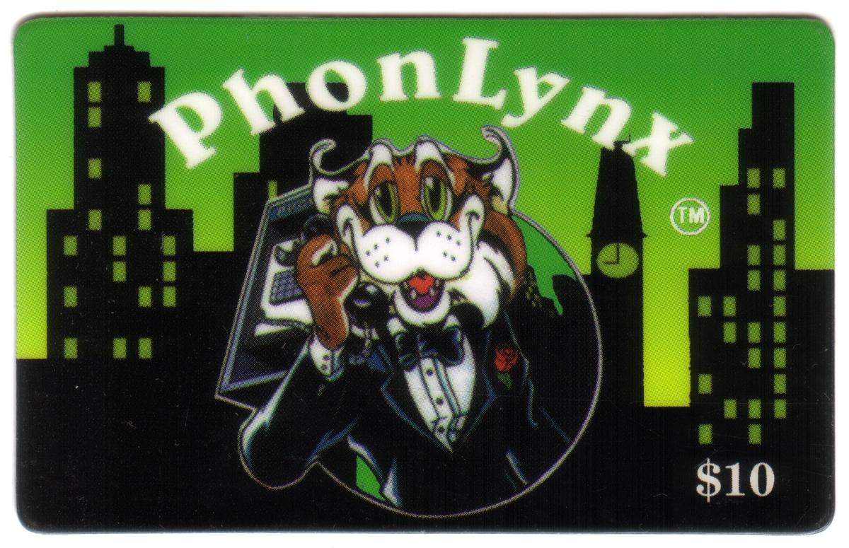 Text elements on the card include a "$10" denomination marking, along with the PhonLynx logo positioned clearly on the front. The card is dated "01/97" and carries the indication "USED," confirming its status as a previously active phone card. The overall design blends artistic and cartoon elements, combining the cityscape, animals, and telephones into a coherent visual representation associated with the PhonLynx brand.