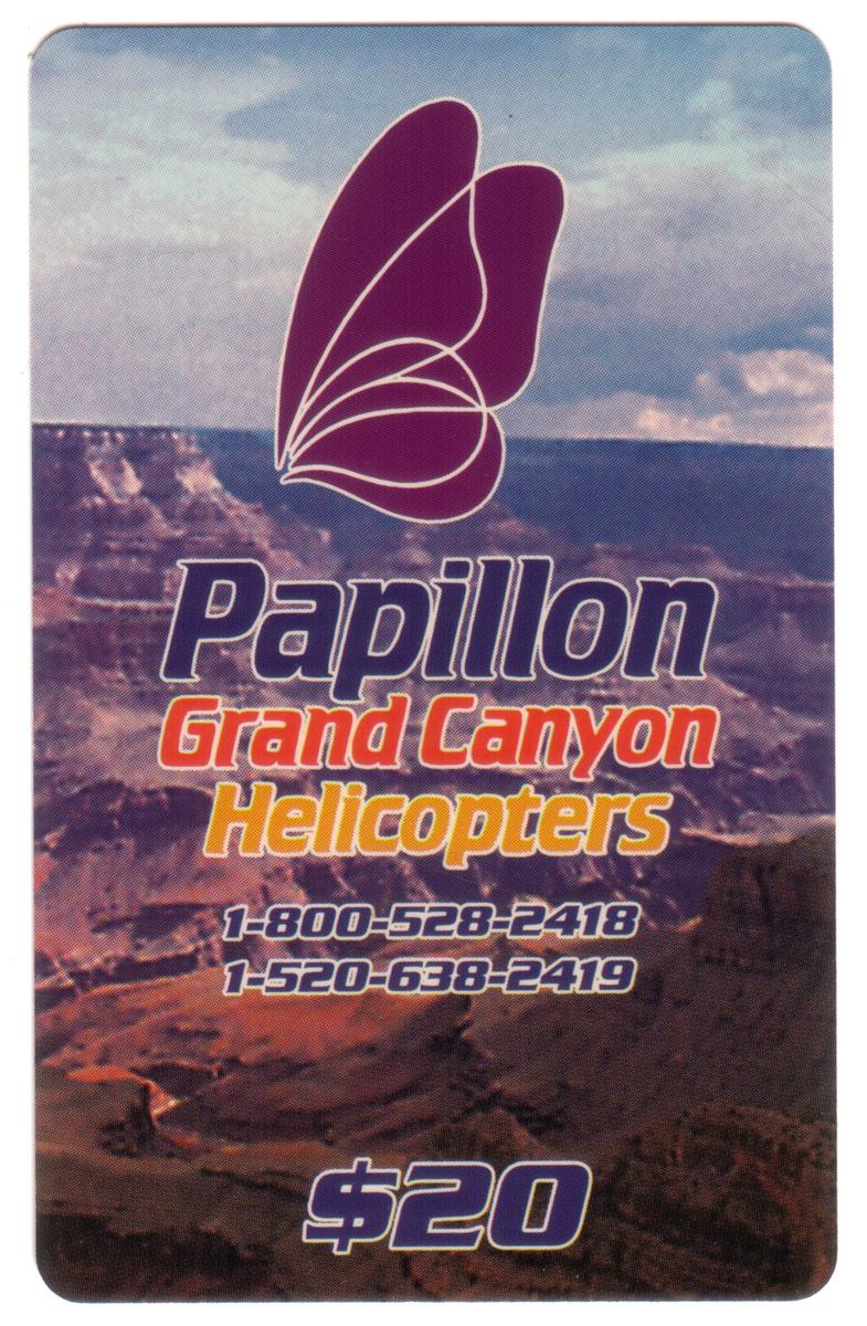 Printed text on the card includes "Papillon Helicopters Rides (Grand Canyon)" and "$20," reinforcing its value and connection to scenic helicopter tours. The composition highlights both the aircraft and the expansive canyon landscape beneath, capturing the essence of travel and exploration.