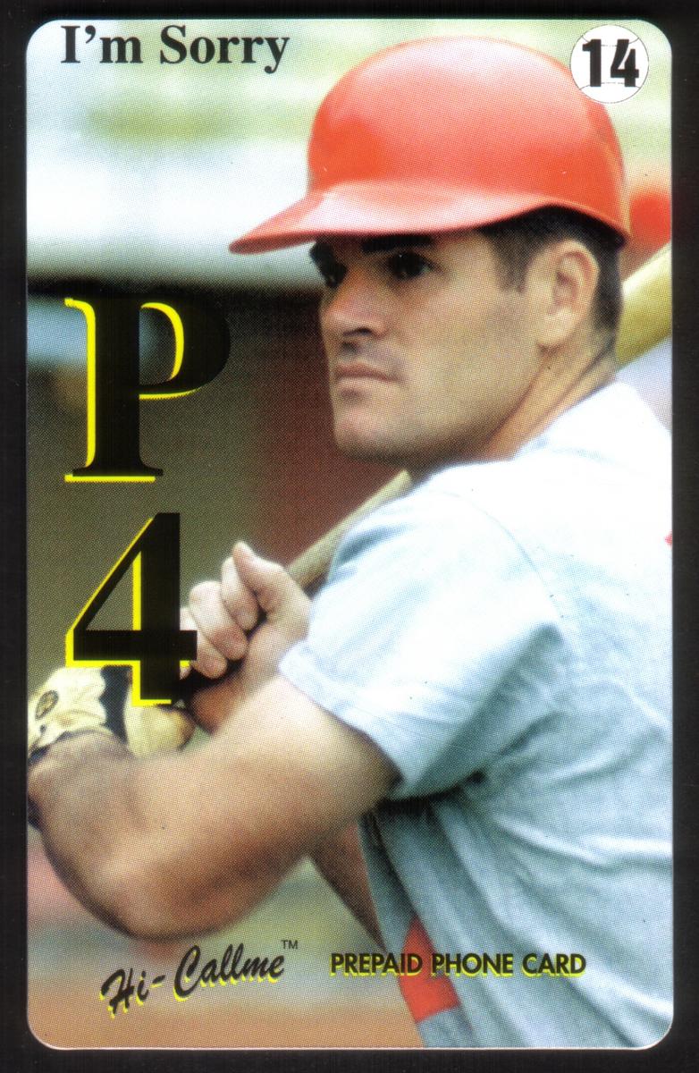 The second card features a close-up side portrait of Pete Rose wearing a red batting helmet, gripping a bat, and looking out to his left. The card displays the phrase "I'm Sorry" and the alphanumeric "P 4." The background is blurred, focusing attention on Rose's concentrated expression.