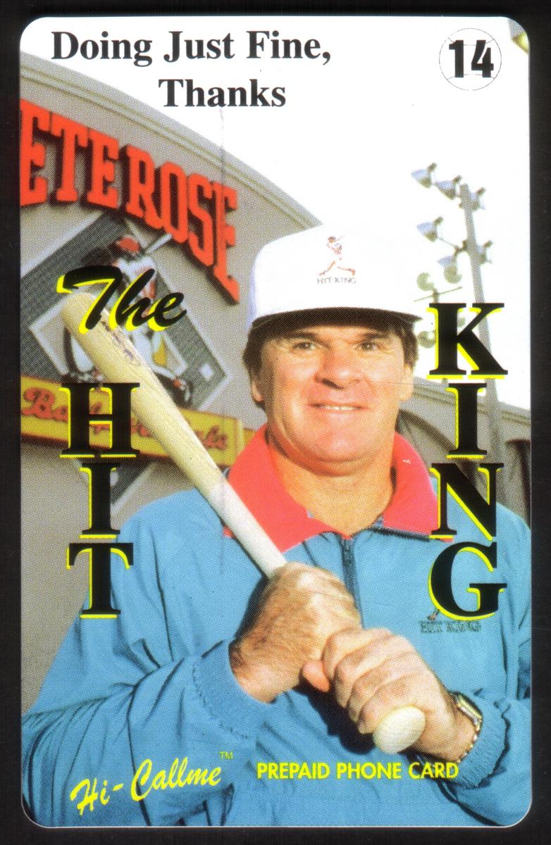 These collectible prepaid phone cards honor the legacy of Pete Rose, known as "The Hit King," through images from different moments of his baseball career and related media appearances.