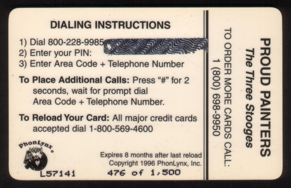 This phone card is titled "Proud Painters" and is produced by PhonLynx. It represents The Three Stooges in their well-known comical style, making it a collectible item for fans of classic films and comedy legends.