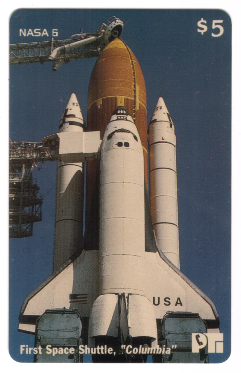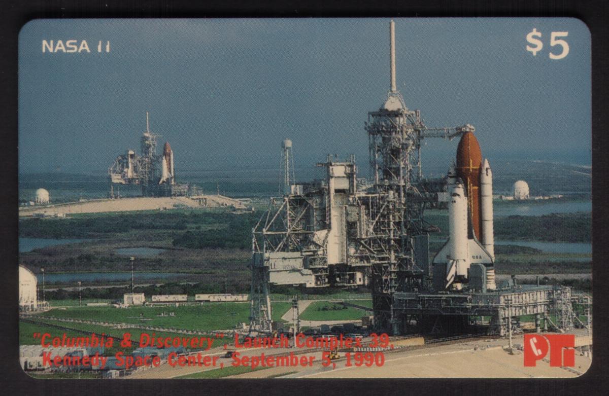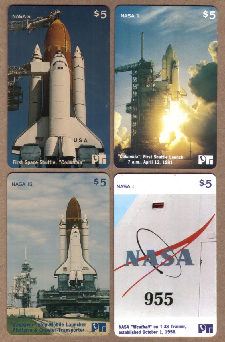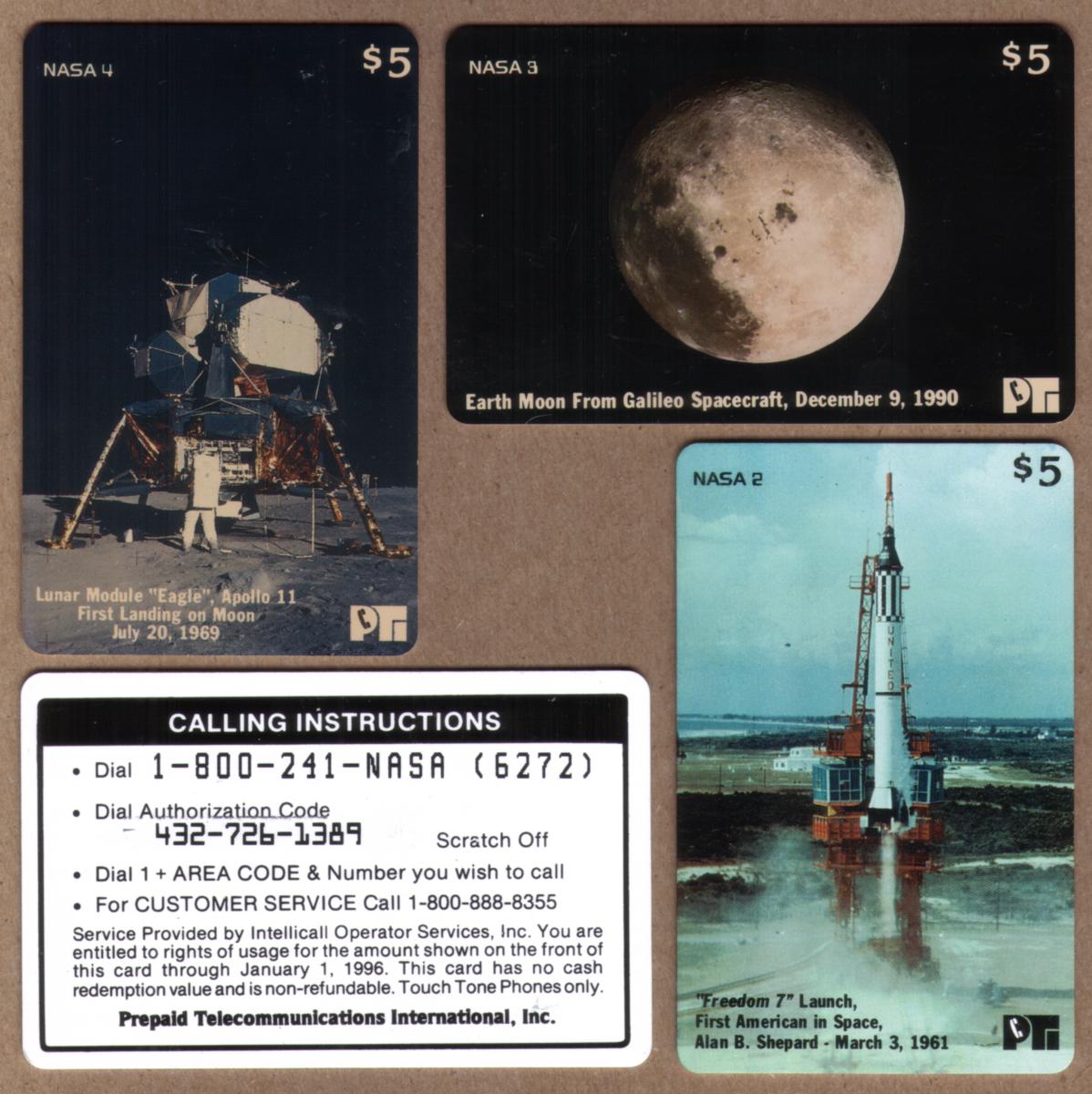 This set of 11 collectible prepaid phone cards features iconic NASA space exploration themes and photography. Each card displays a $5 value and includes a distinct image with related information in red, black, or blue text. The cards highlight key moments and equipment from NASA’s space program, emphasizing spacecraft, launches, landings, and important historical events at the Kennedy Space Center and beyond.