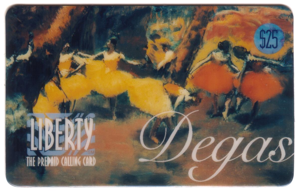The text on the card includes the word "LIBERTY" in large, bold white letters on the left side, accompanied by the phrase "THE PREPAID CALLING CARD" beneath it. On the right side, the card prominently displays "Degas" in elegant, flowing script. A blue circle in the upper right corner contains the card’s $25 value.
