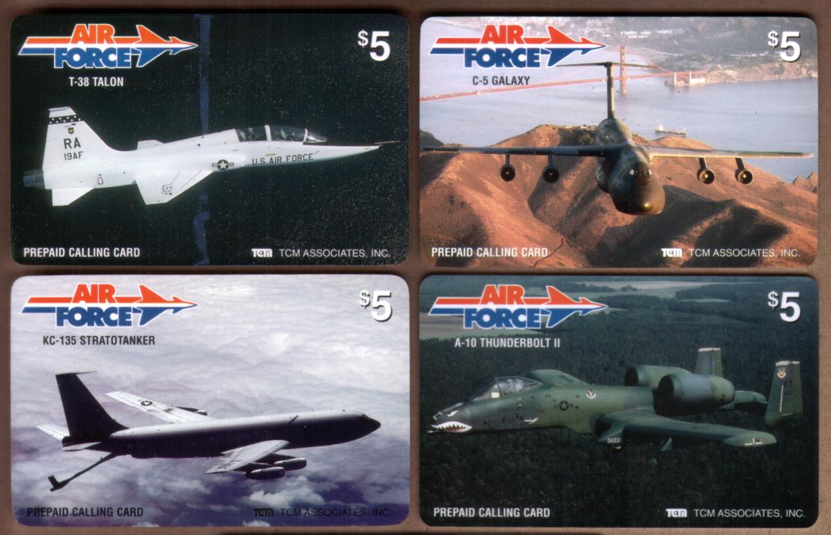 Together, these cards form a set representing prominent Air Force aircraft used for refueling, cargo transport, training, and close air support missions. Each card is designed with vivid photography capturing the aircraft in flight and includes standardized Air Force logos and nominal values for prepaid calling use.