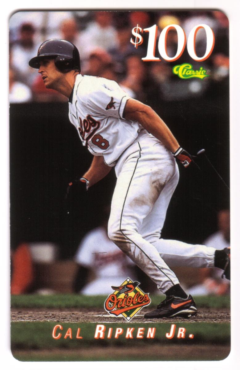 The card displays a large “$100” value in white text near the upper right corner, accompanied by the green and yellow Classic logo beneath it. The Baltimore Orioles team logo is positioned near the bottom center of the card, directly above Cal Ripken Jr.'s name, which is written in orange uppercase letters outlined in white. The card's design emphasizes the player and his team without any other graphics or text.