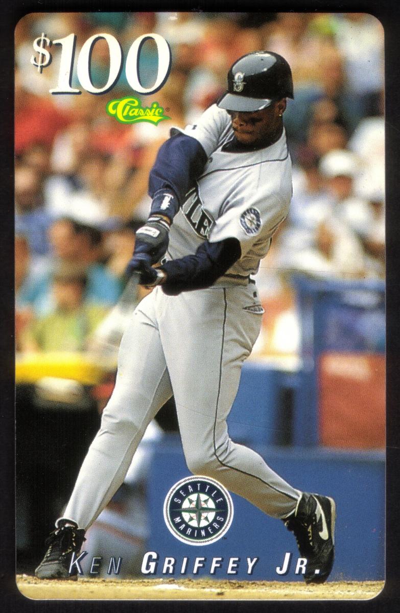 The card has a $100 value prominently displayed in the upper left corner in white text, with the word "Classic" written in green and yellow script below the dollar amount. The background shows a blurred crowd at the stadium, highlighting the action and focus on Griffey Jr. The player’s name, "KEN GRIFFEY JR.," is printed in white with gray shadowing along the bottom of the card, directly above the Mariners logo.