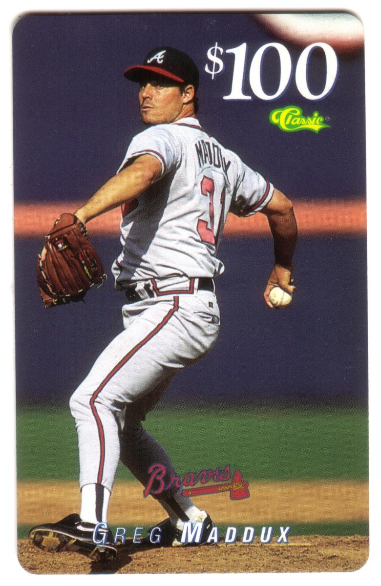 This card commemorates Greg Maddux’s contribution to baseball as a premier pitcher, appearing in the Braves uniform. It is a vertical-oriented collectible issued in connection with the MCI promotion, reflecting its official MLB and Braves licensing.