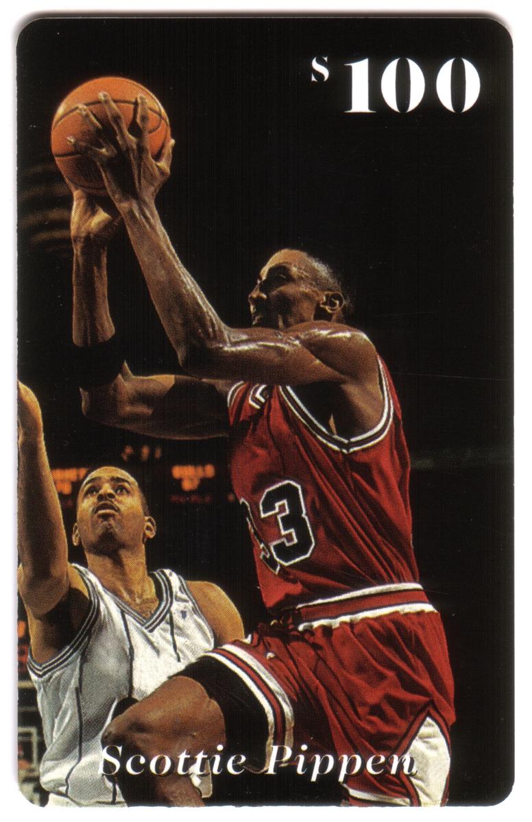 The card displays the denomination "$100" in white text at the top right corner. Scottie Pippen's name is printed at the bottom center in white serif font, clearly identifying the featured athlete. The card’s black background highlights the vivid colors of the Chicago Bulls uniform and the basketball, making the central action stand out sharply.