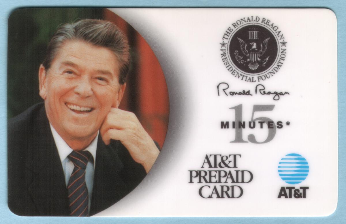 This phone card commemorates President Ronald Reagan and is affiliated with the Ronald Reagan Presidential Foundation. It offers 15 minutes of prepaid calling time with AT&T telecommunications services. The design combines official logos, the portrait of the former U.S. president, and clear denomination details to create a collectible item that highlights Reagan’s legacy and the AT&T brand.