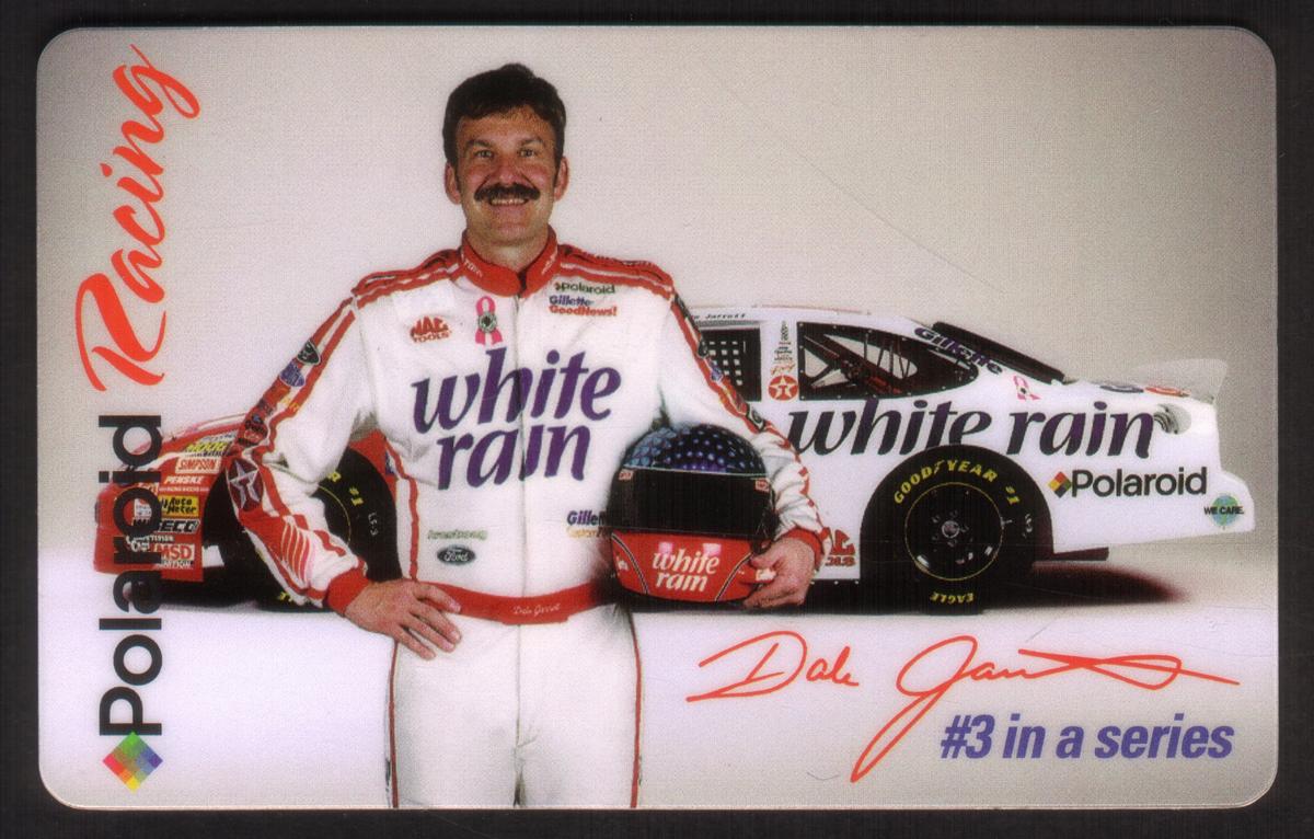 Dale Jarrett NASCAR racing card with signature, featuring his car, sponsor logos, and Polaroid branding, part of a limited series, collectible memorabilia. |