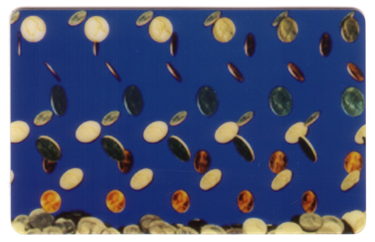 This collectible phone card features an abstract artistic design showcasing multiple coins suspended and floating against a solid, vibrant blue background. The coins vary in color, including shades of white, green, brown, and a metallic tone, creating a visual effect of motion and depth. The arrangement of the coins forms a pattern that resembles coins floating upward or downward, enhancing the three-dimensional illusion.