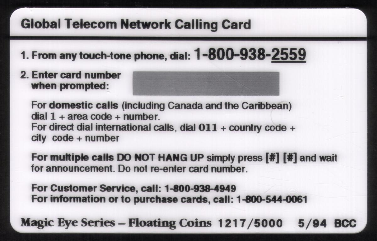 This card is part of the 20u Magic Eye Series (3-D Illusion Artwork) and is titled "Floating Coins." It represents themes related to currency, money, and numismatics. The design emphasizes global connectivity, as it is linked to the Global Telecom Network and WorldCom, whose logos appear on the card. The card merges the artistic abstraction of currency with telecommunications branding, presenting a unique fusion of art and technology.