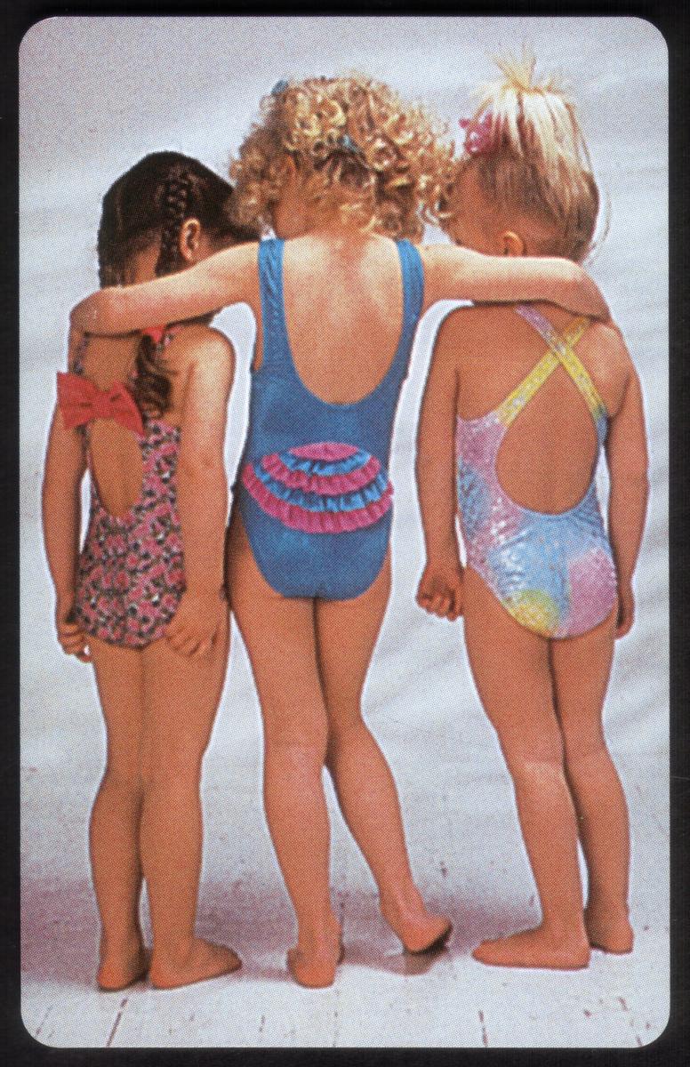 This collectible phone card features a photographic image titled "Artistic 3m Three Young Girls in Swim Suits," taken by James Levin. The photo depicts three young girls standing side by side, each wearing a swimsuit. The image captures the girls outdoors, with natural light highlighting their presence and swimwear colors. The composition is straightforward, focusing solely on the three individuals, with no additional figures or objects visible.