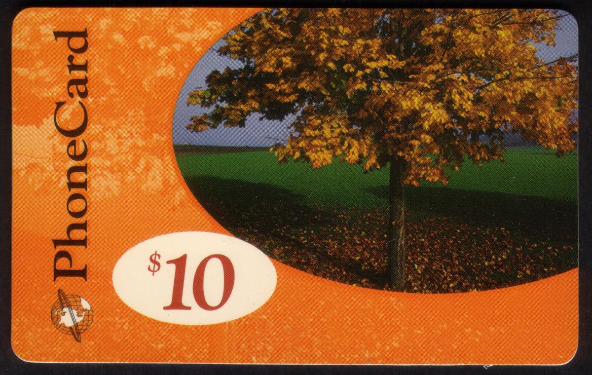 The overall layout is clean and balanced, combining natural imagery with textual information. The card’s design suggests it is a telecommunication-related collectible card intended for users carrying a $10 value. The autumn tree image provides a seasonal aesthetic element, making the card visually attractive while delivering its utility information in a straightforward manner.