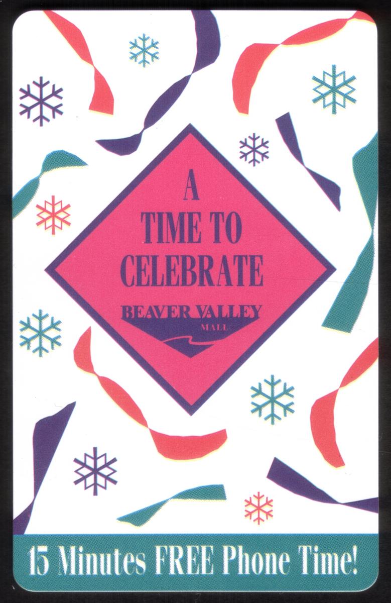 This collectible promotional phone card commemorates a special offer titled "15m Beaver Valley Mall: Free Phone Time 'A Time To Celebrate'." The card prominently features the Beaver Valley Mall as the central visual element, showcasing its exterior under daylight. The mall name is clearly visible, aligning with the card’s theme of advertising free phone time. The phrase "A Time To Celebrate" appears on the card, reinforcing the promotional nature of the giveaway.