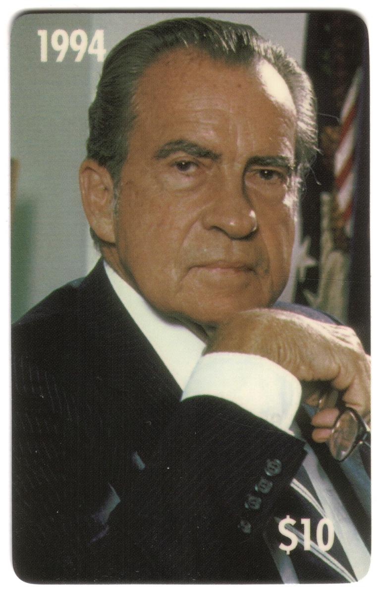 The card has a denomination of US $10, indicated clearly on the front. The overall presentation combines the political theme with the specific focus on Richard Nixon, highlighting his role as an American president associated with the Republican Party and conservative politics. The promotional nature of the card is indicated with the label "Library Promo" alongside the portrait.