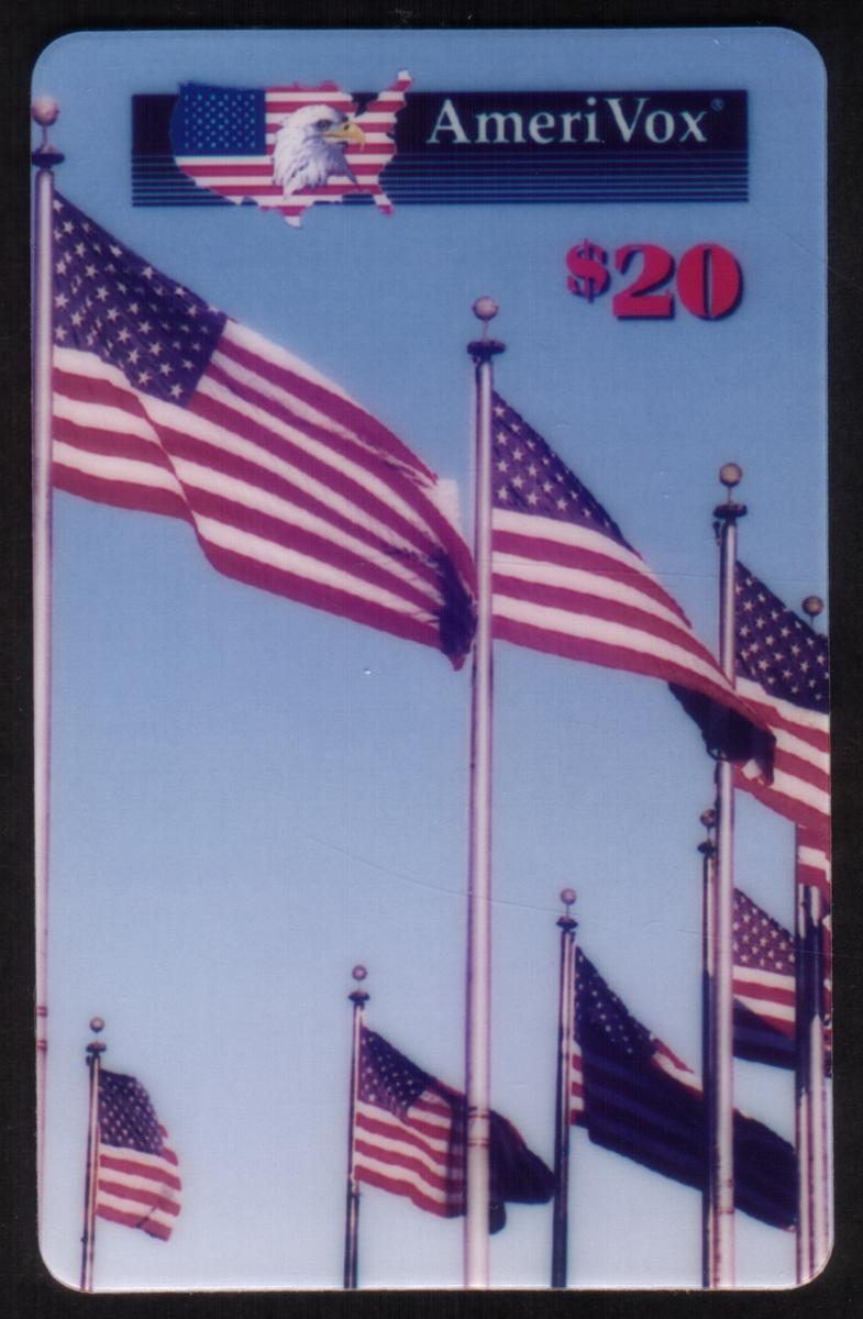 The card includes the text "$20 USA Flags" prominently near the bottom, indicating its denomination and theme. The name "AmeriVox" appears just below the denomination, identifying the issuer or series associated with the card. The overall design reflects Americana and pride in American symbols, centered on the landmark setting of the Washington Monument.
