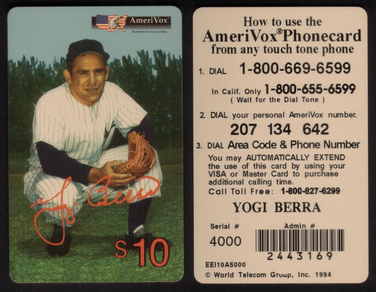 This phone card belongs to a series celebrating baseball and its legends, emphasizing the significant presence of Major League Baseball as represented by one of its most famous players. The overall design highlights both Berra’s iconic status and the sport of baseball.