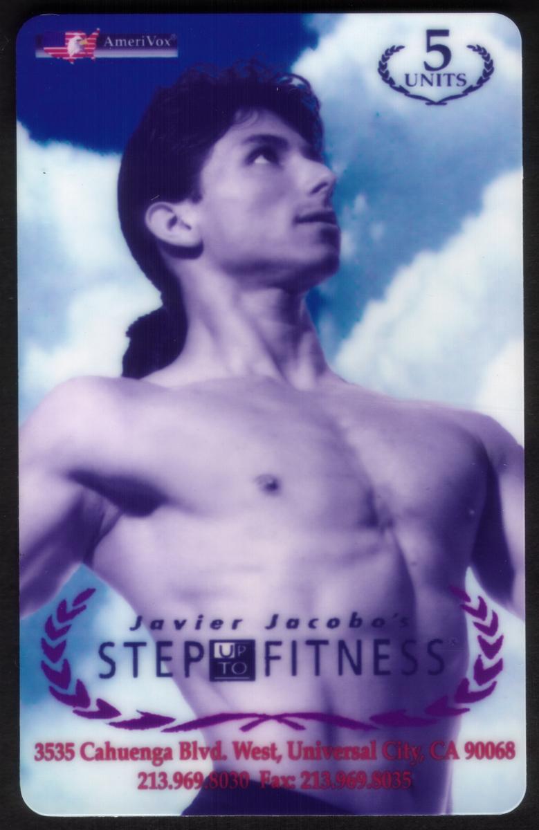 Text on the card includes "Step Up To Fitness" prominently displayed, along with the name "Javier Aaron Jacobo" and the abbreviation "5u Javier Jacobo." The card also references AmeriVox, a company connected to health and fitness products or media. Keywords such as exercise, health, people, men, bodybuilding, and sports (Other) relate directly to the imagery and textual content on the card.