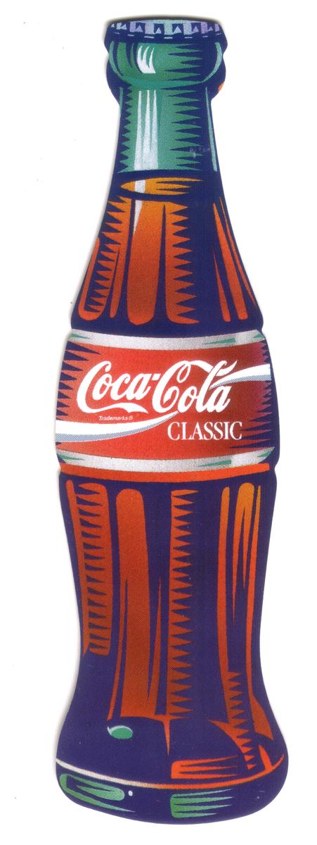 This collectible item is a die-cut card shaped like a classic Coca-Cola glass bottle. The card features the iconic Coca-Cola Classic logo prominently displayed on a white label that wraps around the center of the bottle shape. The design uses bold colors including deep green for the bottle cap and upper neck, rich orange and brown hues to emphasize the glass contours, and stylized highlights and shadows that give it a vibrant, almost illustrated look.