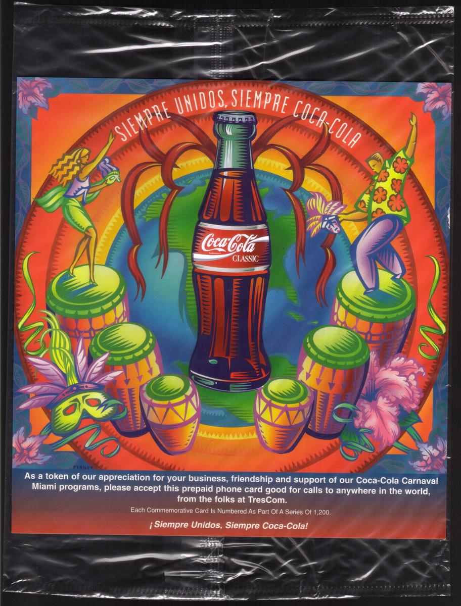 The card is a product of TresCom International and is linked to the Coca-Cola Carnival event held in Miami, Florida. The phrase "Siempre Unidos" is present, emphasizing a message of unity associated with the collectible. Multiple Coca-Cola logos and Coke logos reinforce the branding throughout the card’s design.