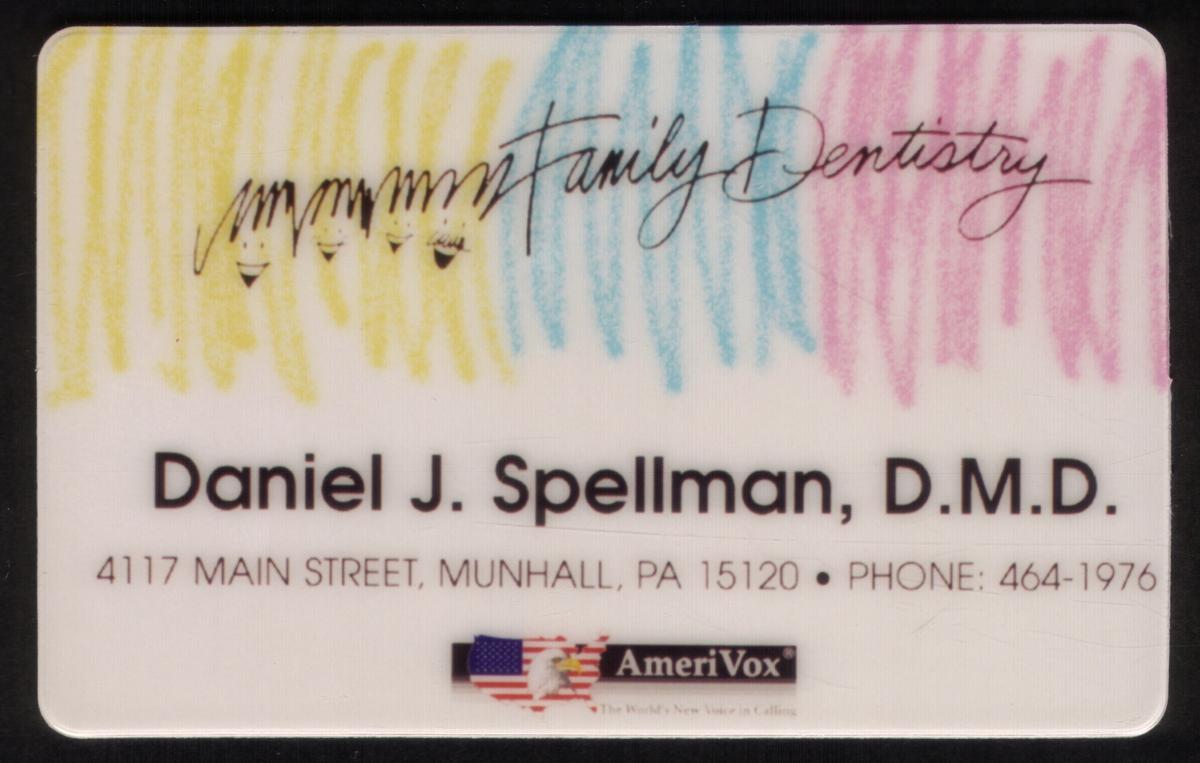 This collectible card features a design related to dentistry and medical health, specifically representing Daniel J. Spellman, DMD, Family Dentistry located in Munhall, Pennsylvania. The card presents the text "Daniel J. Spellman, DMD" prominently in a serif font along with the professional designation “Family Dentistry” beneath the name. The location “Munhall, PA” is also clearly stated on the card, directly associating the practice with the geographic area.