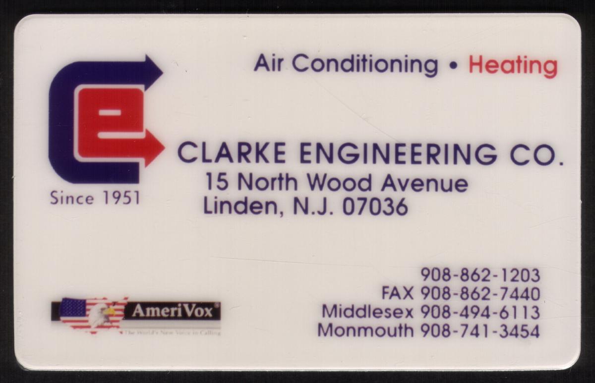 This card serves as a representation of Clarke Engineering Co.’s presence in the corporate air conditioning and heating sector in New Jersey. Its design highlights essential contact and company identification information tailored for business use and corporate networking.