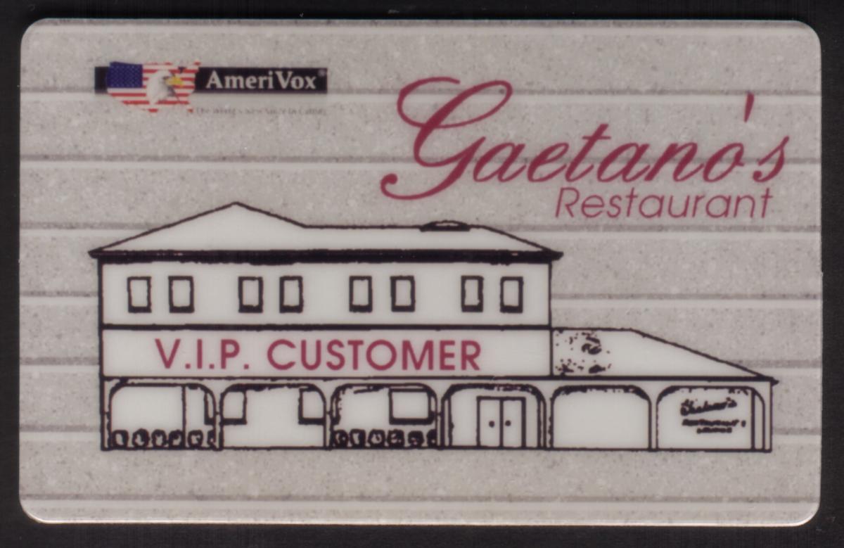 The card includes the AmeriVox logo positioned in the upper left corner, indicating the manufacturer or issuing company. The background texture is subtly striped in light gray, enhancing the card’s visual presentation while maintaining focus on the restaurant graphic and text. This card is meant for promotional or collectible use related to dining at Gaetano's Italian Restaurant.