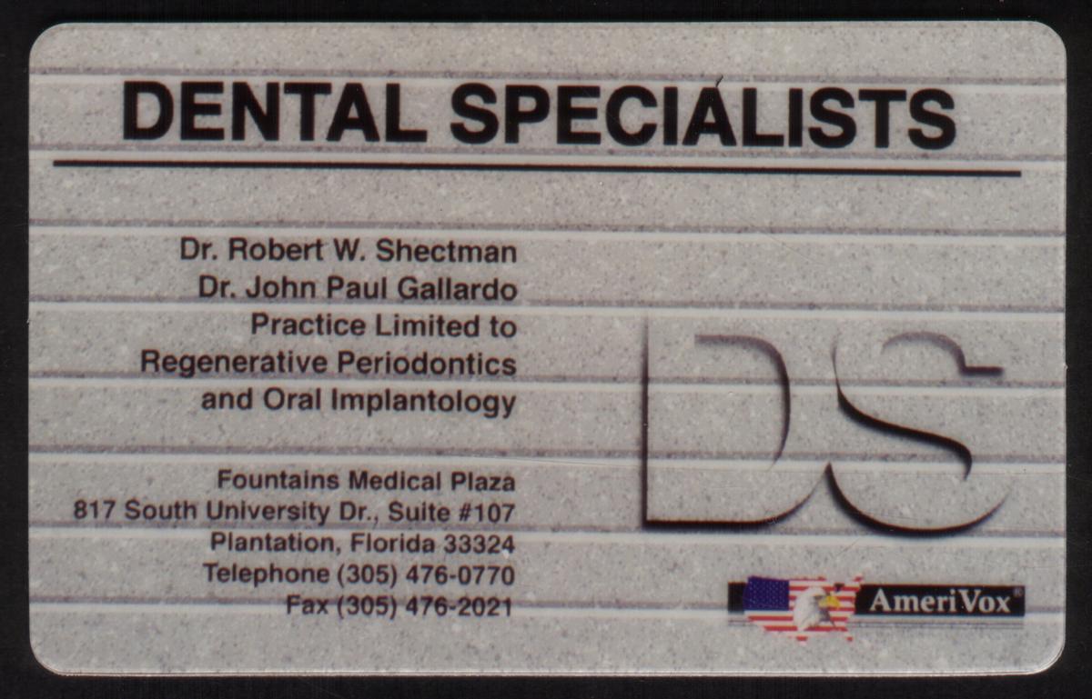 This collectible corporate business card features the names Dr. Robert W. Shectman and Dr. John Paul Gallardo prominently displayed on the front. It is associated with Dental Specialists - Shectman & Gallardo, who specialize in periodontics, regenerative periodontics, and oral implantology. The card includes reference to Fountains Medical Plaza, located in Plantation, Florida, which is the professional address for the practice.
