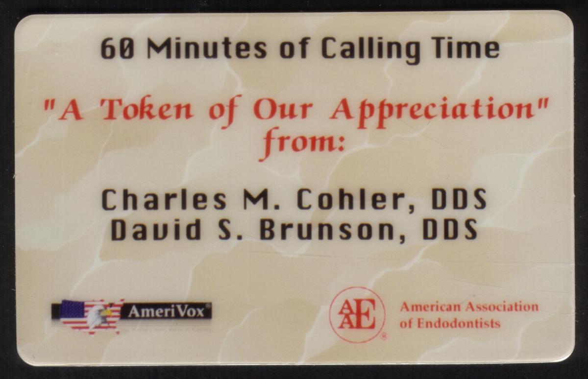 This collectible phone card features a medical theme, specifically promoting dental health and endodontics. The front prominently displays the names Charles M. Cohler, DDS, and David S. Brunson, DDS, identifying them as endodontists. The design includes a detailed depiction of a dental X-ray image illustrating a tooth and surrounding structures, emphasizing professional dental care.