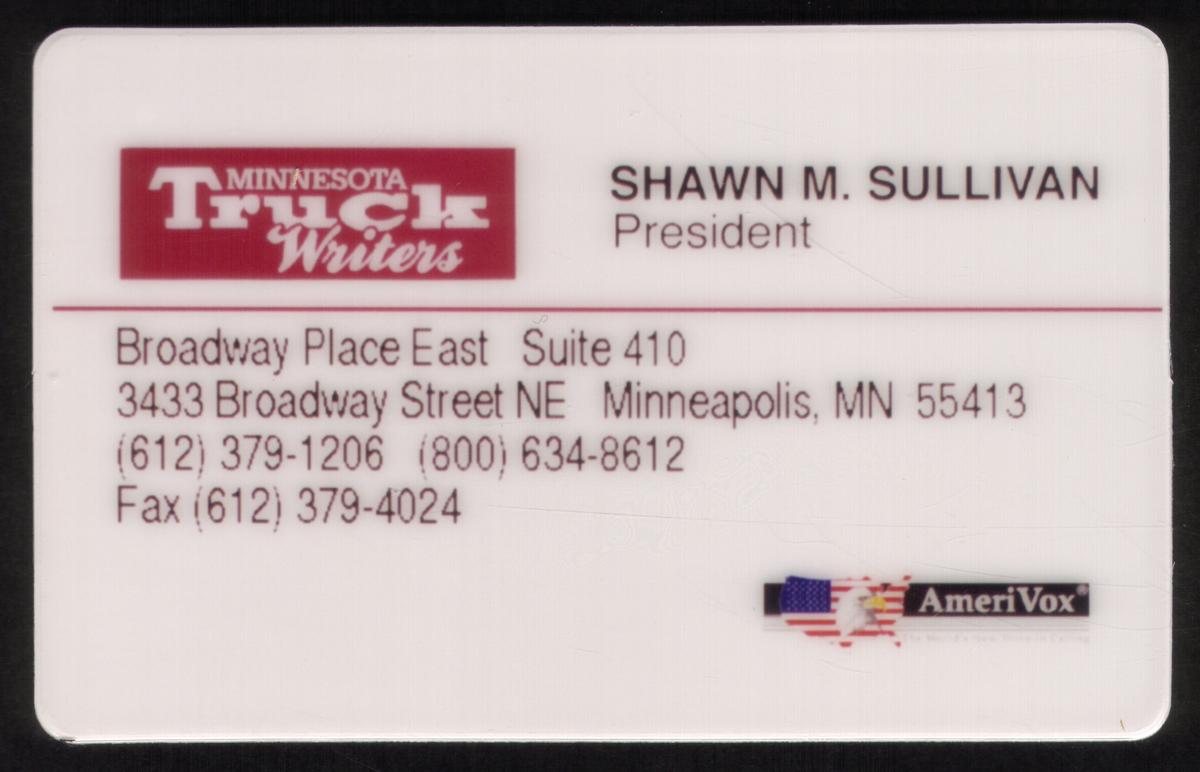 This item is a corporate business card linked to Minnesota Truck Writers and highlights roles tied to automotive and transportation fields in Minneapolis, Minnesota. The presence of AmeriVox suggests communication or service industry ties within this business context.