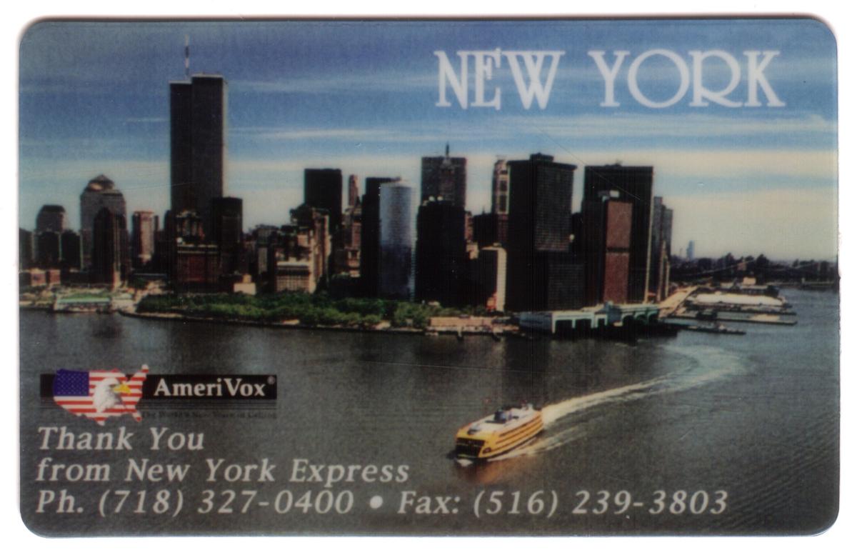 The card includes the logo and branding for AmeriVox, marking it as a proof item. Text on the card designates it as the "New York Express," and the overall presentation conveys a strong travel and transportation motif centered around New York’s world-famous waterfront.