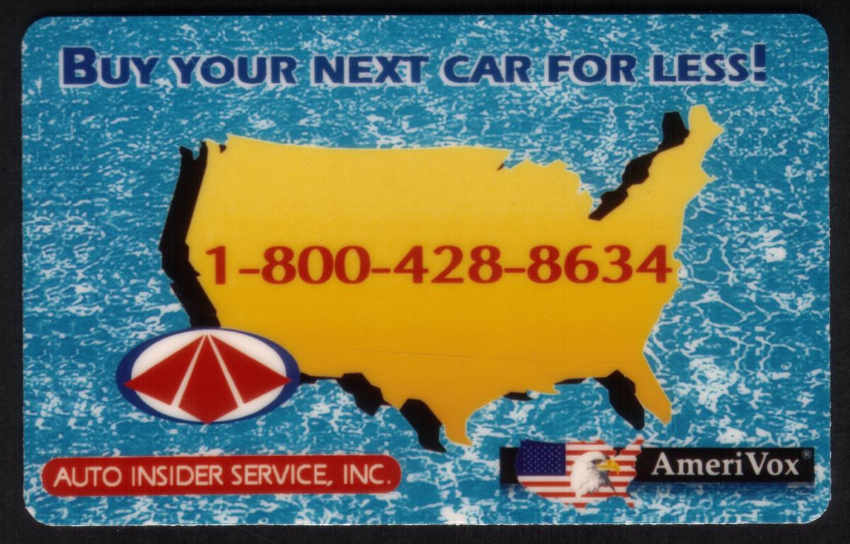 Overall, this chip card is a corporate business collectible item tied to American automotive sales and services, featuring a USA map graphic and branding from Auto Insider Service, Inc., capturing the essence of car buying and automotive advertising.