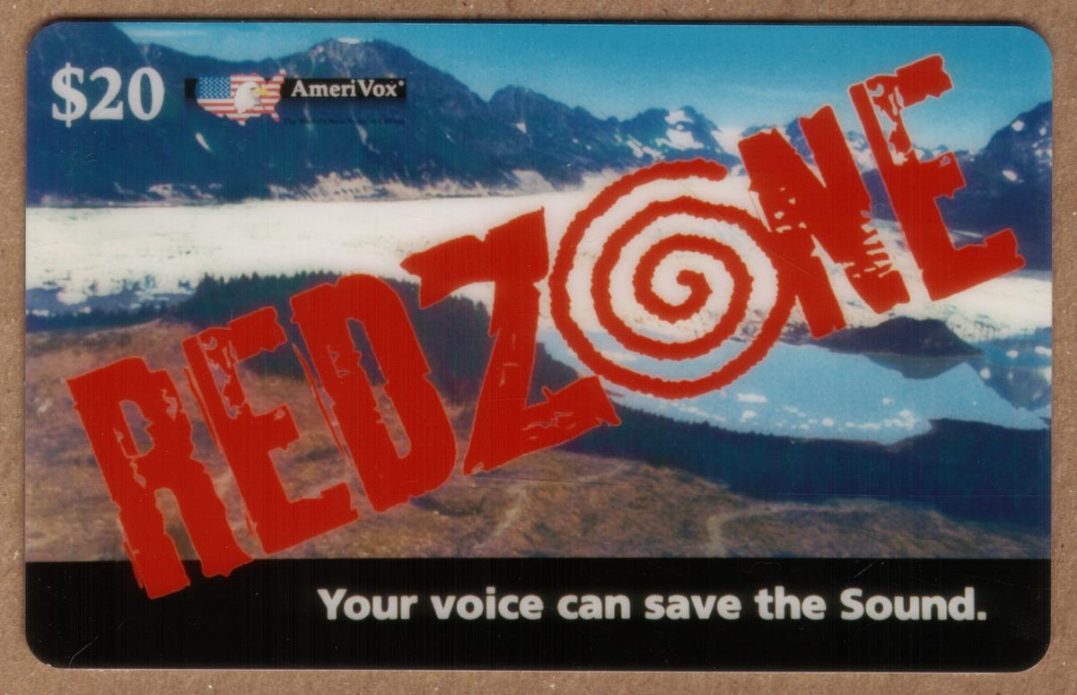 This collectible phone card features a scenic image of the Prince William Sound in Alaska, showing majestic snow-capped mountains and calm waters under a clear sky. Prominently displayed over the landscape is the bold red text "REDZONE" with a spiral design integrated into the "O." Beneath the image, the phrase "Your voice can save the Sound." appears in white text on a black background strip.