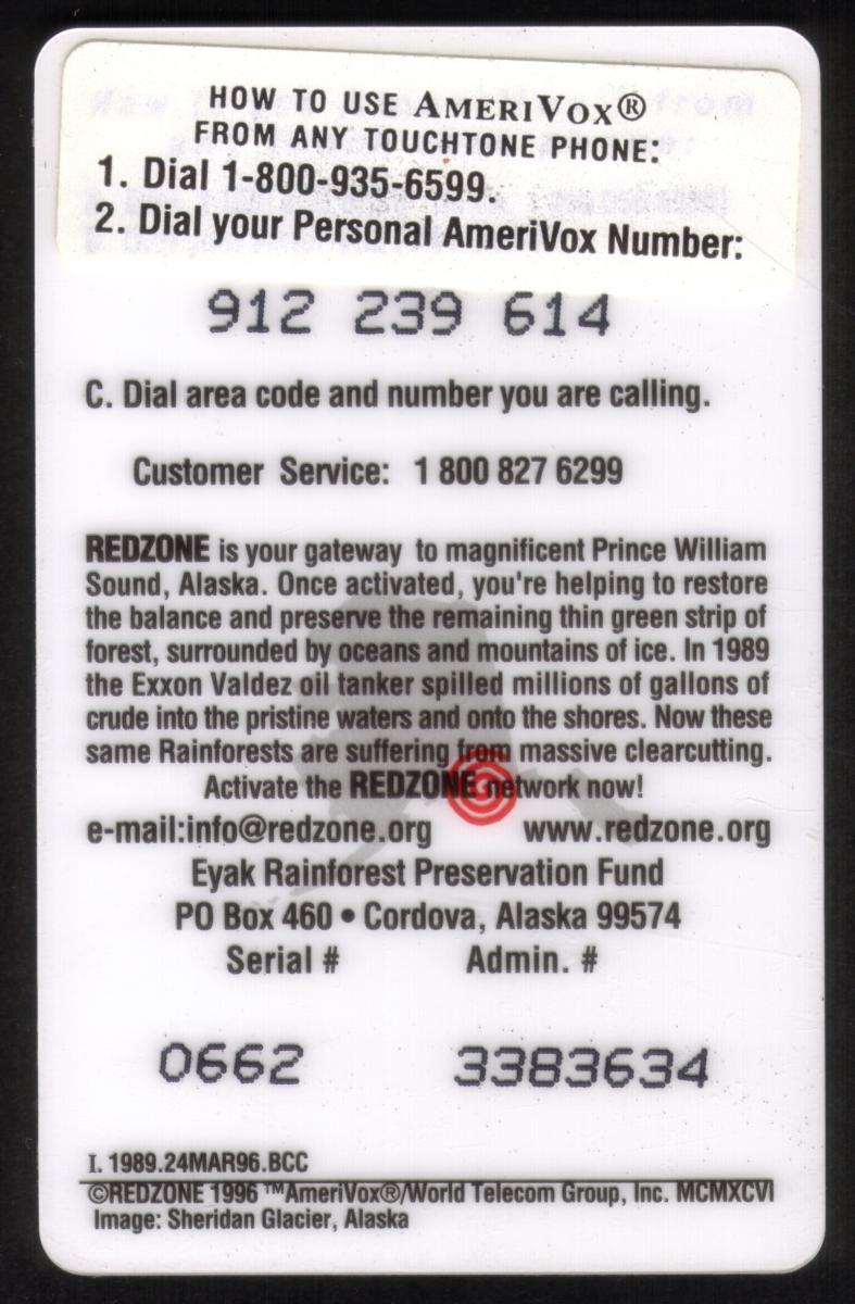 The card is valued at $20 and includes the AmeriVox logo along with an American flag graphic in the upper left corner. It is connected to environmental preservation efforts in Alaska, specifically the Eyak Rainforest Preservation Fund and the response to the Exxon Valdez oil spill. These elements emphasize the importance of protecting the natural beauty and ecological health of the region, highlighting nature preserves and environmental concerns surrounding the Prince William Sound.